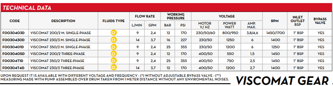 Piusi Viscomat Gear bao gồm: Viscomat 200/2M , Viscomat 200/2T , Viscomat 230/3M, Viscomat 230/3T, Viscomat 350/2T. Với lưu lượng cũng như cột áp phù hợp với từng yêu cầu